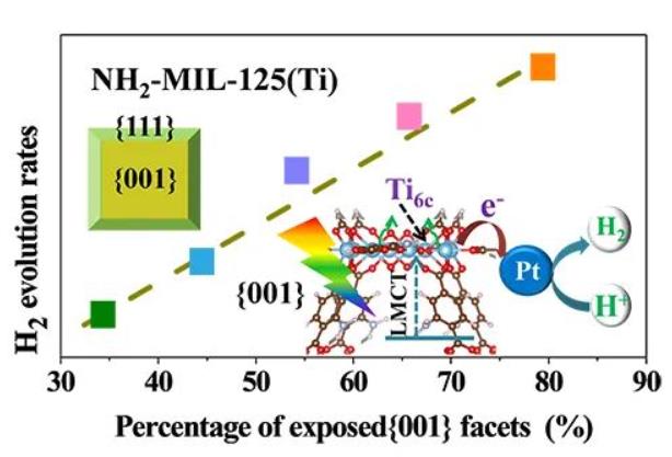 近日,大連化物所太陽能研究部太陽能制儲氫材料與催化研究組(DNL1621)章福祥研究員等人在MOF材料晶面誘導光催化電荷分離與分解水制氫活性研究中取得新進展,通過控制合成了不同{001}/{111}晶面暴露比例的NH2-MIL-125(Ti)片,發現其光催化分解水制氫半反應活性高度依賴于暴露{001}晶面比例,并利用理論計算和多種表征技術等揭示了其背后的結構影響本質,發現具有豐富飽和配位Ti原子(Ti6c)的{001}晶面更有利于捕獲和傳遞光生電子,進而促進電荷分離。