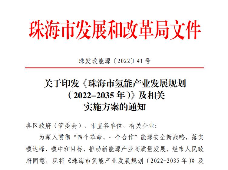 氫啟未來網(wǎng)獲悉,近期珠海市發(fā)展和改革局在其官網(wǎng)發(fā)布關于印發(fā)《珠海市氫能產(chǎn)業(yè)發(fā)展規(guī)劃(2022-2035 年)》及相關實施方案的通知!