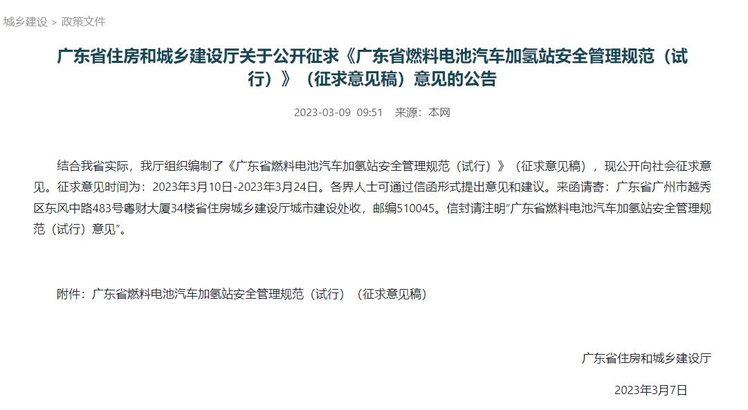 氫啟未來網(wǎng)獲悉,3月9日,廣東省住房和城鄉(xiāng)建設(shè)廳印發(fā)關(guān)于公開征求《廣東省燃料電池汽車加氫站安全管理規(guī)范(試行)》(征求意見稿)意見的公告