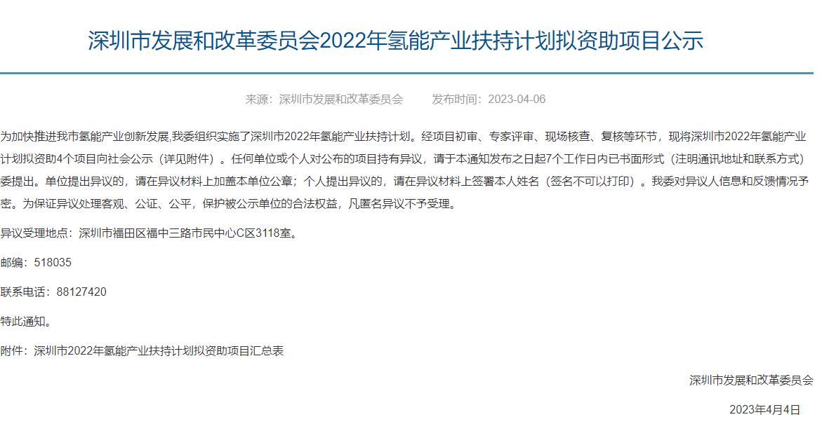 氫啟未來網(wǎng)獲悉,4月6日,深圳市發(fā)展和改革委員會(huì)發(fā)布2022年氫能產(chǎn)業(yè)扶持計(jì)劃擬資助項(xiàng)目公示。