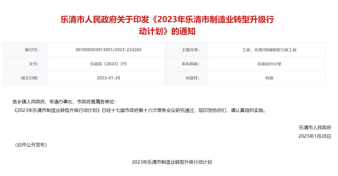 氫啟未來網獲悉,1月28日,樂清市人民政府印發(fā)《2023年樂清市制造業(yè)轉型升級行動計劃》