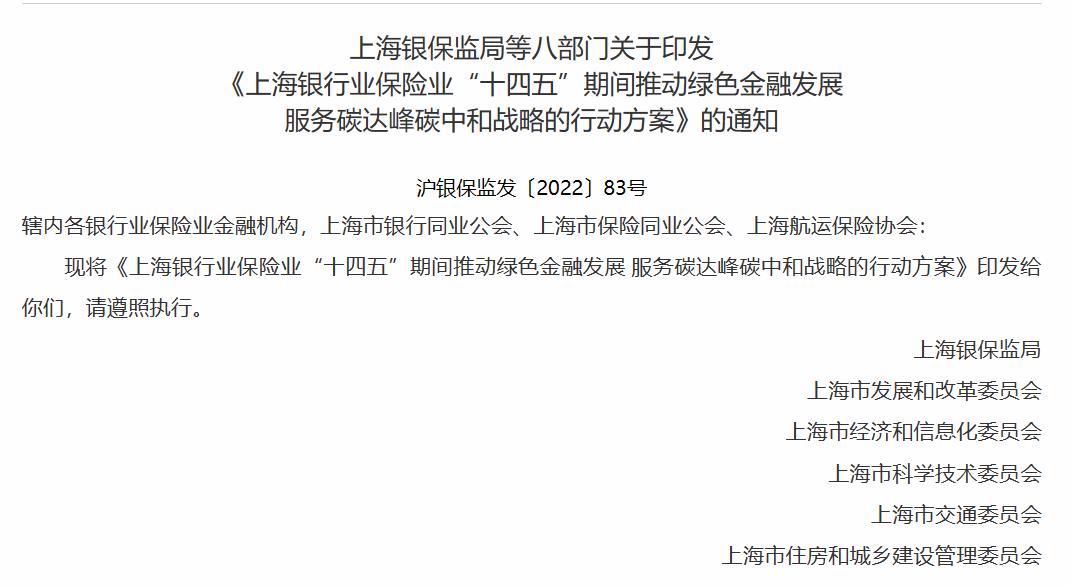 氫啟未來網獲悉,1月9日,上海銀保監局、上海市發展和改革委員會、上海市經濟和信息化委員會、上海市科學技術委員會、上海市交通委員會、上海市住房和城鄉建設管理委員會、上海市生態環境局、上海市地方金融監督管理局等把部門聯合印發《上海銀行業保險業“十四五”期間推動綠色金融發展 服務碳達峰碳中和戰略的行動方案》。