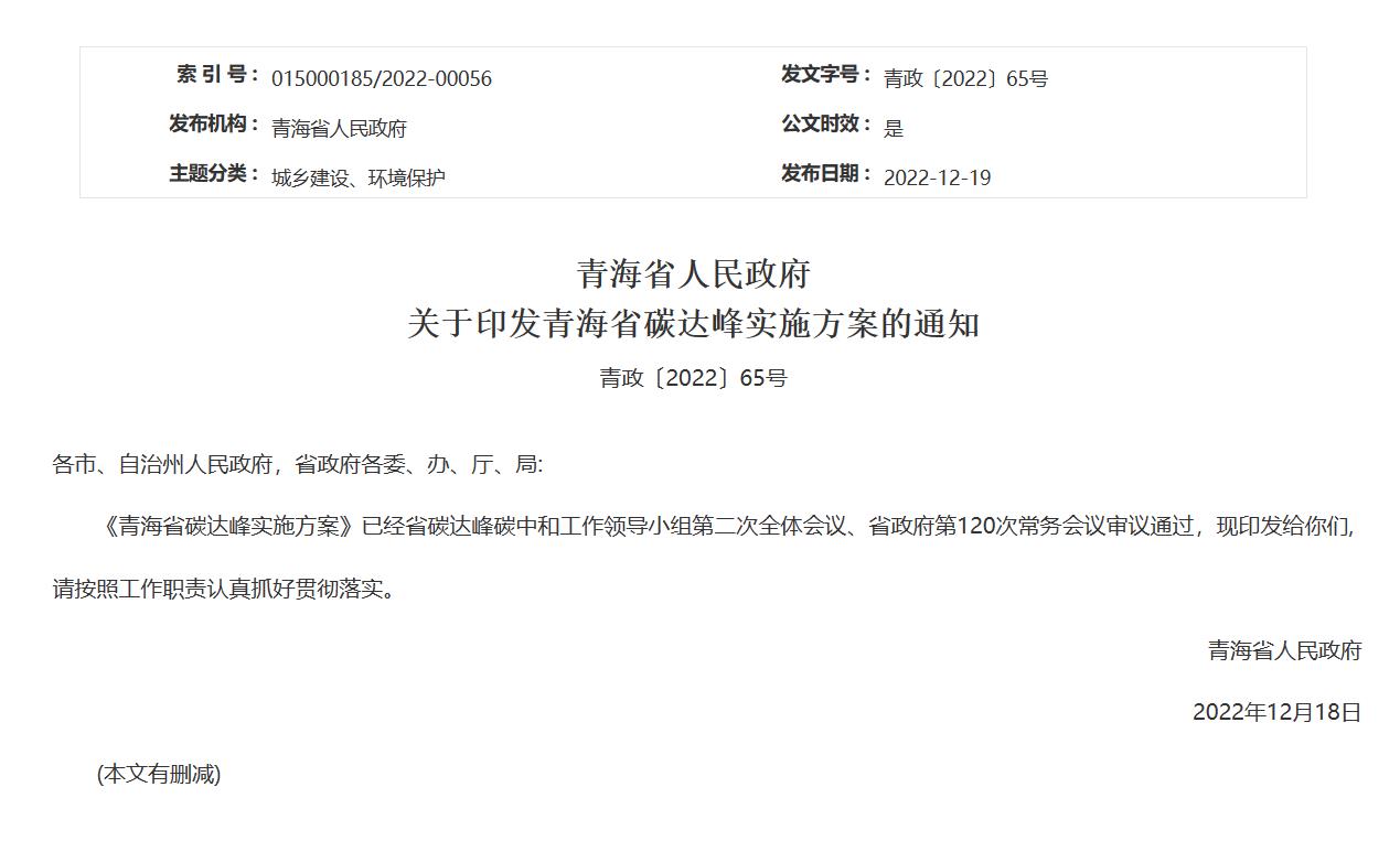 12月19日,青海省人民政府發(fā)布關(guān)于印發(fā)青海省碳達(dá)峰實施方案的通知