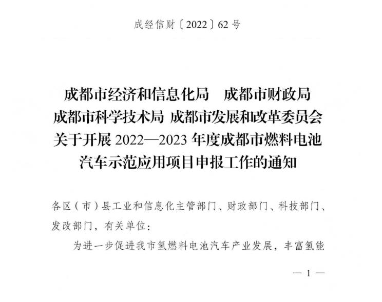 12月22日,成都市經(jīng)濟(jì)和信息化局、成都市財政局、成都市科學(xué)技術(shù)局、成都市發(fā)展和改革委員會4部門聯(lián)合印發(fā)《關(guān)于開展2022-2023年度成都市燃料電池汽車示范應(yīng)用項目申報工作》的通知。