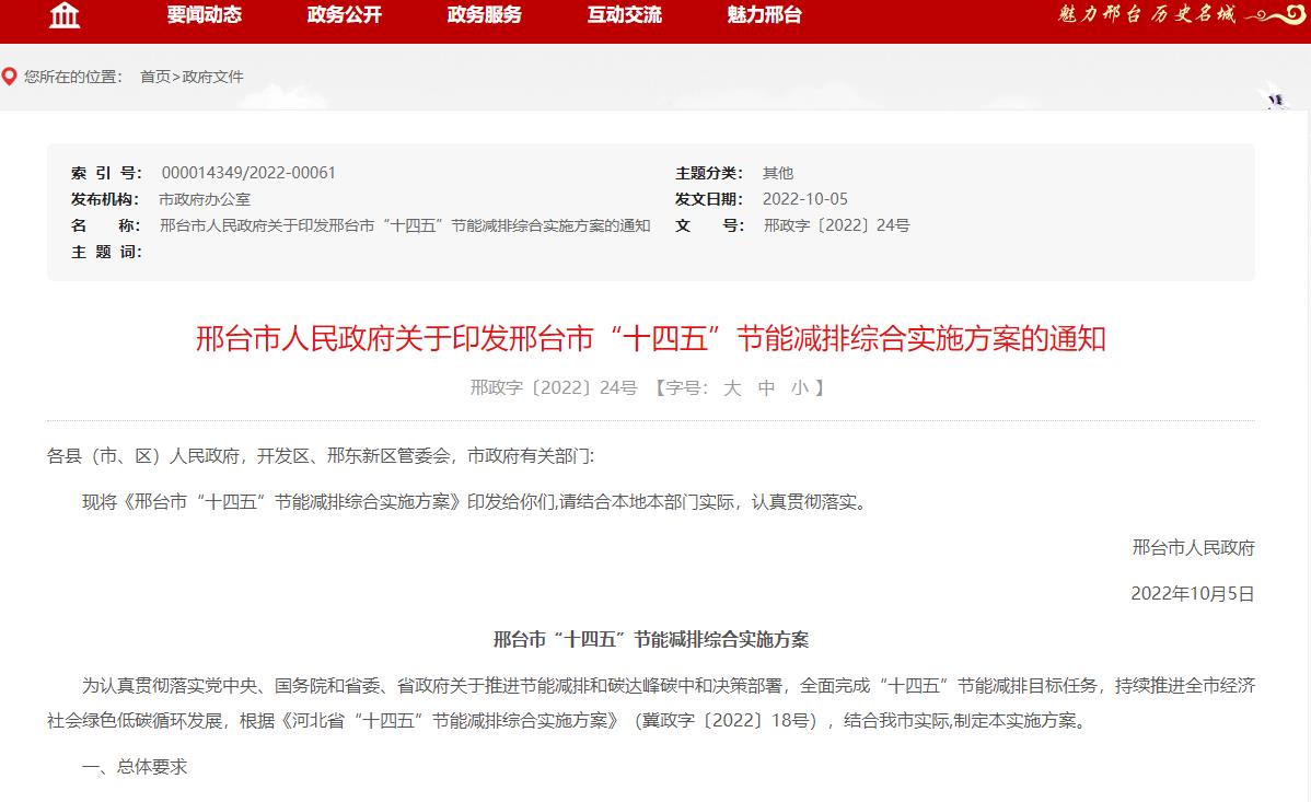 10月5日,邢臺市人民政府發(fā)布關(guān)于印發(fā)邢臺市“十四五”節(jié)能減排綜合實(shí)施方案的通知