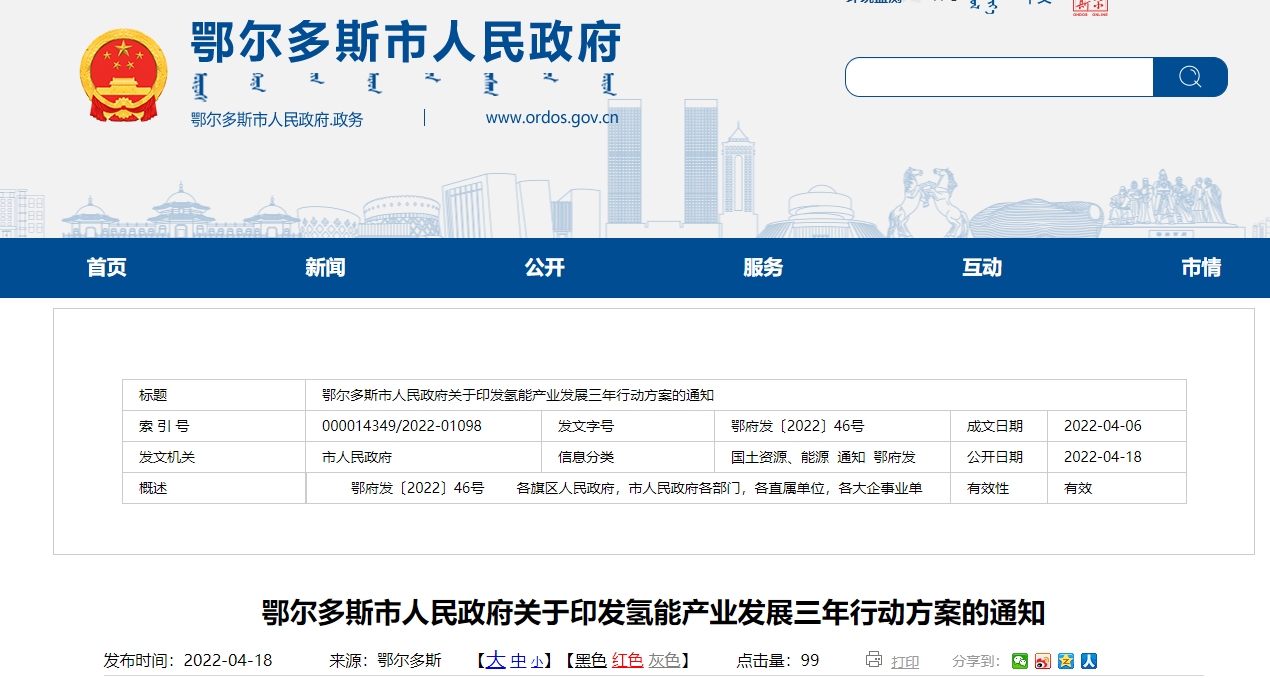 4月18日,鄂爾多斯市人民政府發(fā)布了《關(guān)于印發(fā)氫能產(chǎn)業(yè)發(fā)展三年行動方案的通知》。到2024年,開展可再生能源制氫示范項(xiàng)目8個以上,通過示范推廣、產(chǎn)業(yè)培育和技術(shù)攻關(guān),實(shí)現(xiàn)鄂爾多斯市氫能裝備產(chǎn)業(yè)及綜合應(yīng)用突破性發(fā)展。至2024年,鄂爾多斯市可再生氫產(chǎn)量達(dá)20萬噸/每年。至2024年,累計建設(shè)加氫站60座,燃料電池車輛推廣超過3000輛,打造5個以上10萬噸級綠色化工項(xiàng)目。