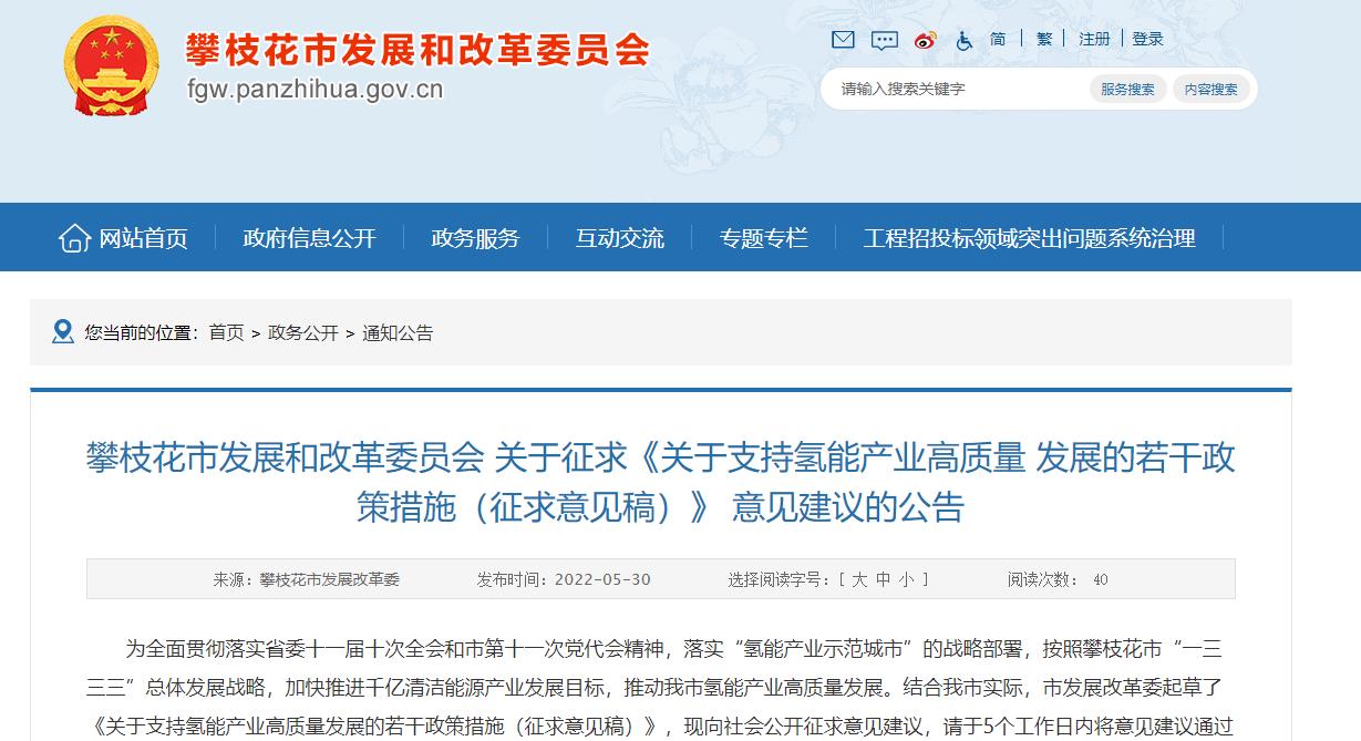 攀枝花市發(fā)展和改革委員會 關(guān)于征求《關(guān)于支持氫能產(chǎn)業(yè)高質(zhì)量 發(fā)展的若干政策措施(征求意見稿)》 意見建議的公告