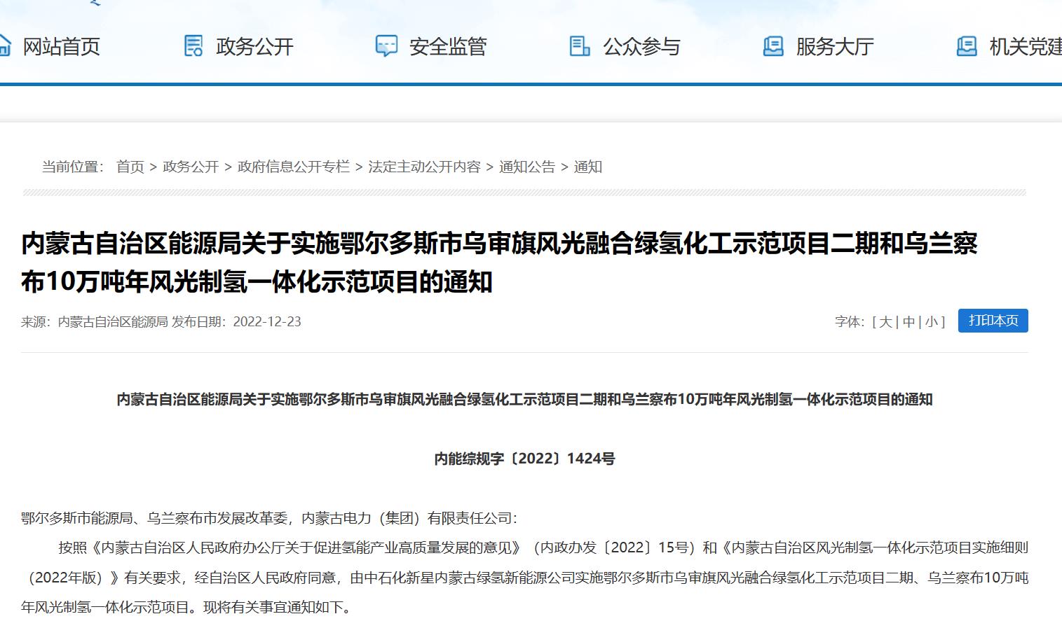 氫啟未來網獲悉,12月23日,內蒙古自治區能源局發布通知信息稱,將由中石化新星內蒙古綠氫新能源公司實施鄂爾多斯市烏審旗風光融合綠氫化工示范項目二期、烏蘭察布10萬噸年風光制氫一體化示范項目。