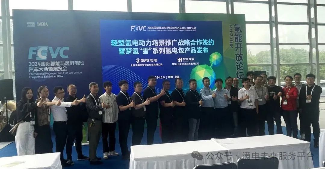 6月6日,在上海汽車會展中心召開的,由中國汽車工程學會與國際氫能燃料電池協會共同主辦的“2024國際氫能與燃料電池汽車大會暨展覽會(FCVC 2024)上,夢氫能源與滿電未來就輕型氫電動力應用場景推廣,進行了戰略合作簽約暨夢氫“雪系列”空冷氫電包發布會,夢氫能源董事長張亮和滿電未來執行總裁王強出席了簽約儀式。