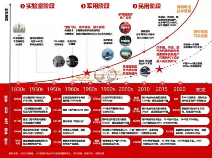 2015年之后燃料電池汽車進入商業化推廣階段,以Mirai和Clarity的上市代表著面向私人乘用車領域開始銷售,正式進入商業化階段。