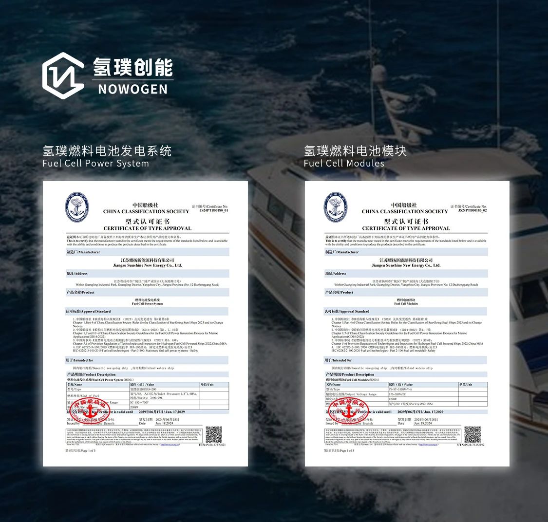 2024年6月18日,氫璞創能旗下子公司江蘇耀揚新能源科技有限公司自主研發的200kW船用燃料電池發電系統(OCEAN-200),成功獲得了中國船級社(CCS)型式認可,填補了國內單系統200kW級船用燃料電池系統的空白。
