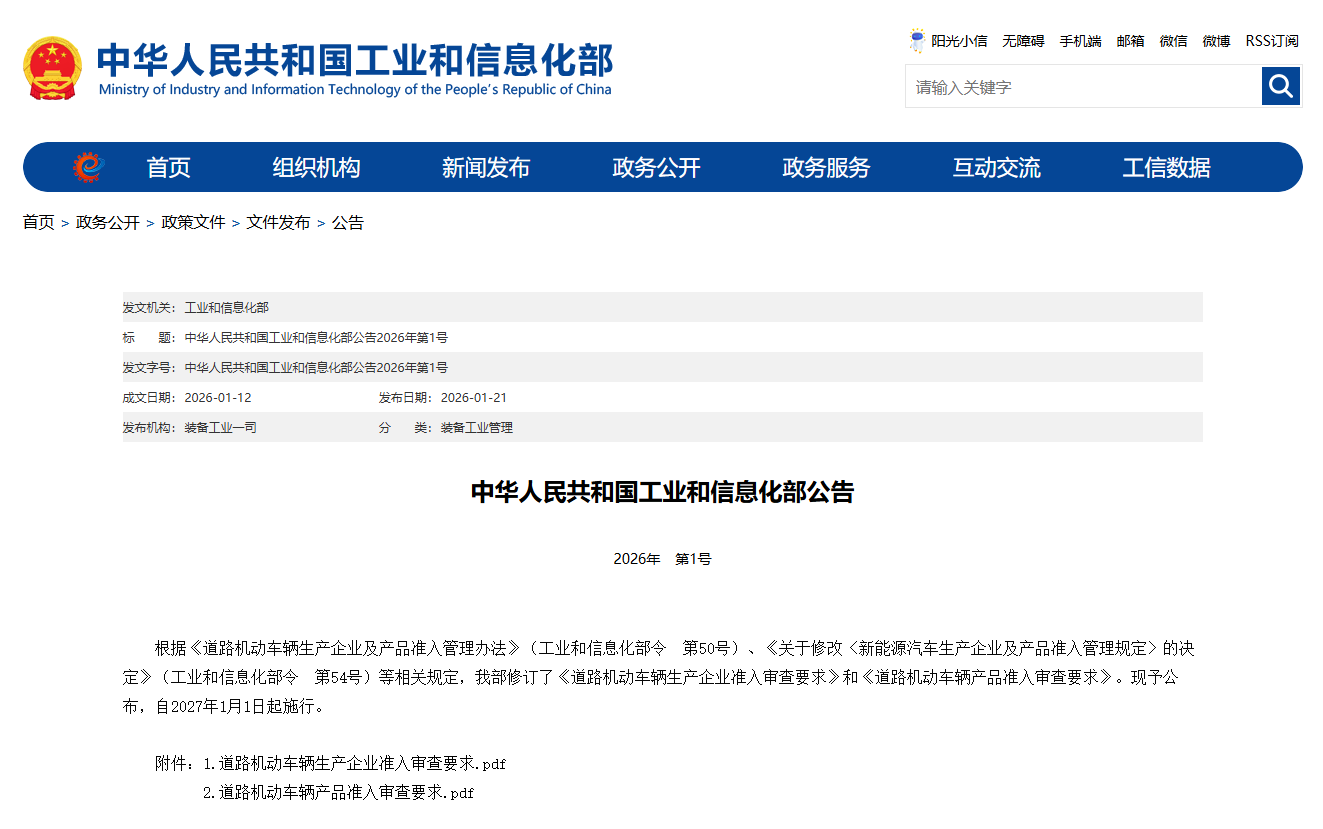 1月21日,工信部發(fā)布了2026年第1號公告,修訂了《道路機動車輛生產企業(yè)準入審查要求》和《道路機動車輛產品準入審查要求》,自2027年1月1日起施行。《道路機動車輛生產企業(yè)準入審查要求》和《道路機動車輛產品準入審查要求》于2019年1月18日由工信部發(fā)布,確保只有具備足夠研發(fā)、生產、售后和安全保障能力的企業(yè),才能進入市場造車?,是國家用來?管住汽車生產源頭、保障車輛安全和行業(yè)秩序?的一套核心規(guī)則,自2019年6月1日起實施。此次為第一次修訂,相較之前,新增了對新能源汽車包括氫燃料電池汽車在內等多類型車輛的生產企業(yè)準入審查要求和產品準入審查要求。