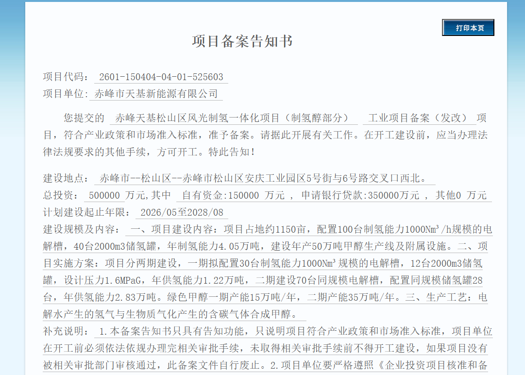 1月23日,據(jù)內(nèi)蒙古自治區(qū)投資項(xiàng)目在線(xiàn)審批辦事大廳信息顯示,天合光能旗下子公司赤峰市天基新能源有限公司的赤峰天基松山區(qū)風(fēng)光制氫一體化項(xiàng)目(制氫醇部分)獲備案。