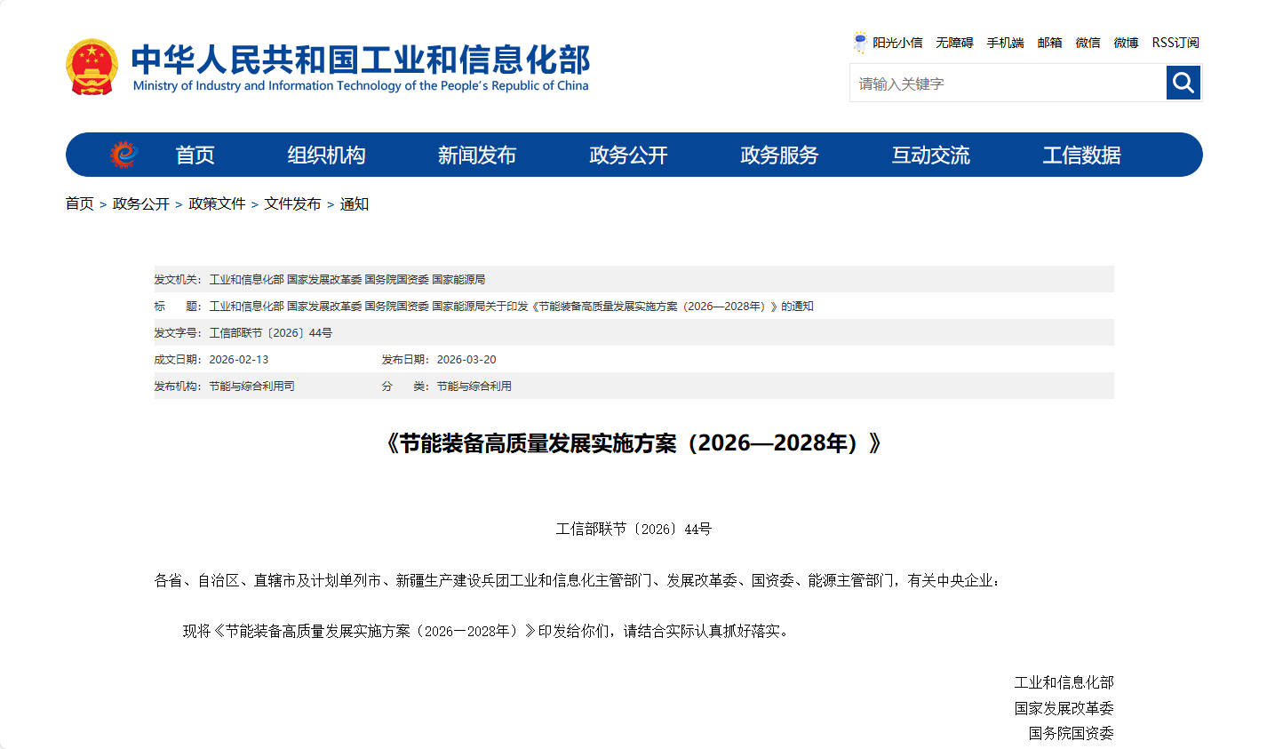 3月20日,工業和信息化部、國家發展改革委、國務院國資委、國家能源局關于印發《節能裝備高質量發展實施方案(2026—2028年)》(以下簡稱“《方案》”),持續提升通用性強、用能量大、發展前景突出的節能裝備能效水平,加強節能裝備供給與應用,促進工業能源利用效率提升,實現碳達峰碳中和目標。
