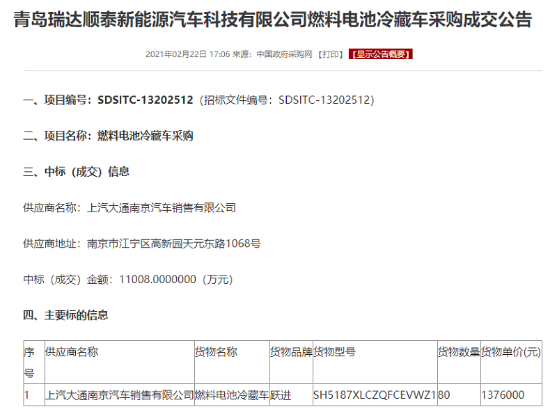 對比今年的另一大單,青島瑞達(dá)順泰新能源汽車科技有限公司采購的80輛燃料電池冷藏車項目,于2月22日公告上汽大通中標(biāo),中標(biāo)金額1.1億,單價137.6萬元。