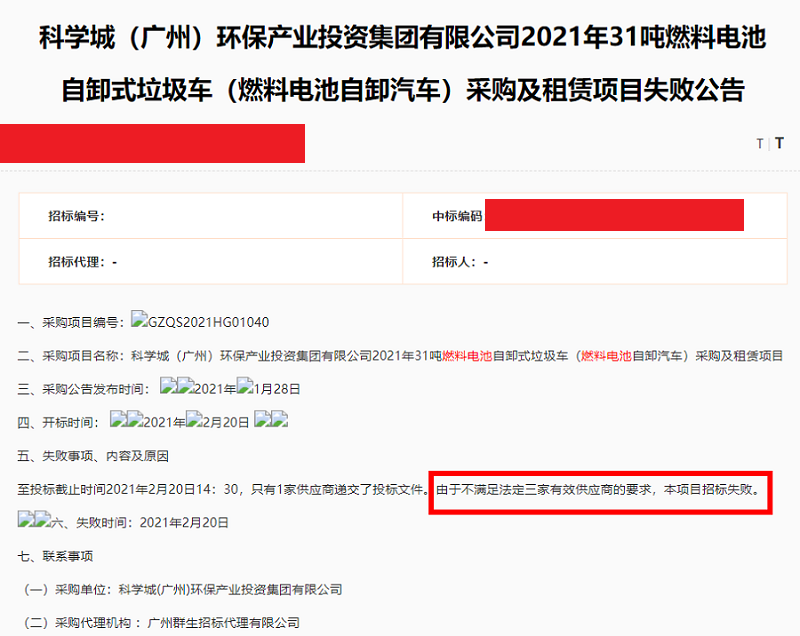 2021年2月20日,科學(xué)城(廣州)環(huán)保產(chǎn)業(yè)投資集團有限公司的500輛31噸燃料電池自卸式垃圾車采購及租賃項目,因只有1家供應(yīng)商提供了投標(biāo)文件,不滿足法定要求,公告失敗。