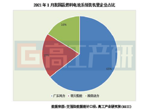 從燃料電池裝機量和配套企業來看,2021年1月我國氫燃料電池系統裝機量約為5.2MW,同比下降74%,裝機量企業排名分別為廣東鴻力氫動科技有限公司(下稱“廣東鴻力”)、安徽明天氫能科技股份有限公司(下稱“明天氫能”)和濰柴動力。