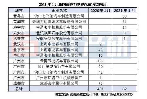 高工產研氫電研究所(GGII)發布的《燃料電池汽車月度數據庫》統計顯示,2021年1月我國氫燃料電池汽車銷量為82輛,全部為氫燃料電池客車。