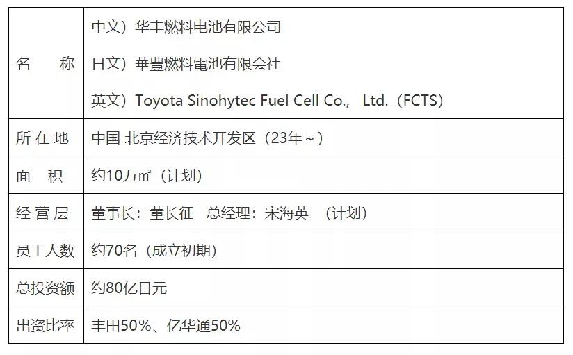 去年8月,億華通、豐田及其他4家汽車廠商合作成立“聯(lián)合燃料電池系統(tǒng)研發(fā)(北京)有限公司”,此次華豐燃料電池公司將生產(chǎn)及銷售聯(lián)合燃料電池公司開發(fā)的燃料電池系統(tǒng),并于2021年成立,總投資額約為80億日元,億華通和豐田各出資50%。