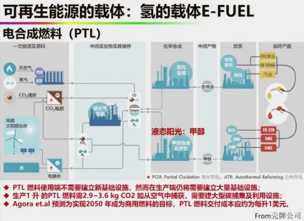 目前在很火的“液態(tài)陽光”,即“清潔甲醇”,利用光伏等可再生能源產生的電力電解水,制成氫,再補獲二氧化碳,生成甲醇,但捕獲二氧化碳成本很高,僅可用于飛機和遠洋貨輪。