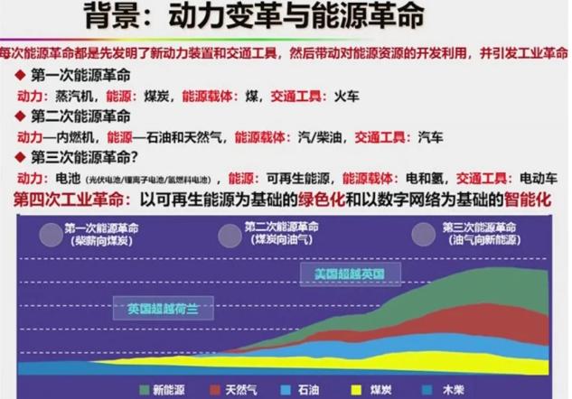 以蒸汽機為動力、煤炭為載體、火車為交通工具的第一次能源革命,讓英國超過了荷蘭;以內燃機為動力、汽柴油為載體、汽車為交通工具的第二次能源革命讓美國超越了英國。