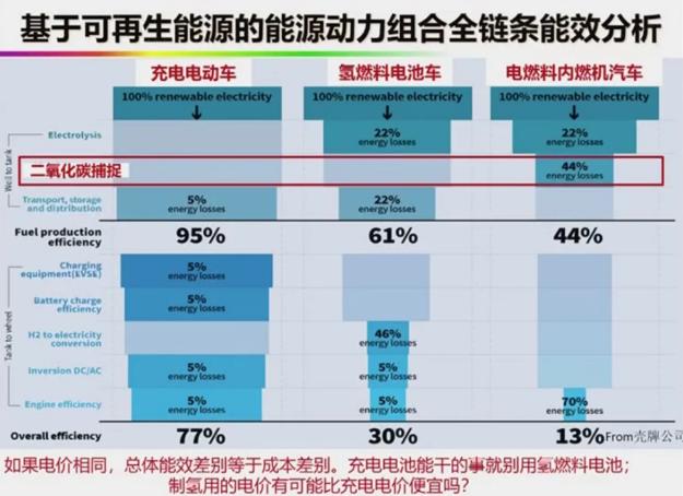 如果所有電力都來源于可再生能源,將電動汽車、氫燃料電池汽車、綠色甲醇的內燃機汽車進行比較,全生命周期能源效率,還是電動汽車最高。