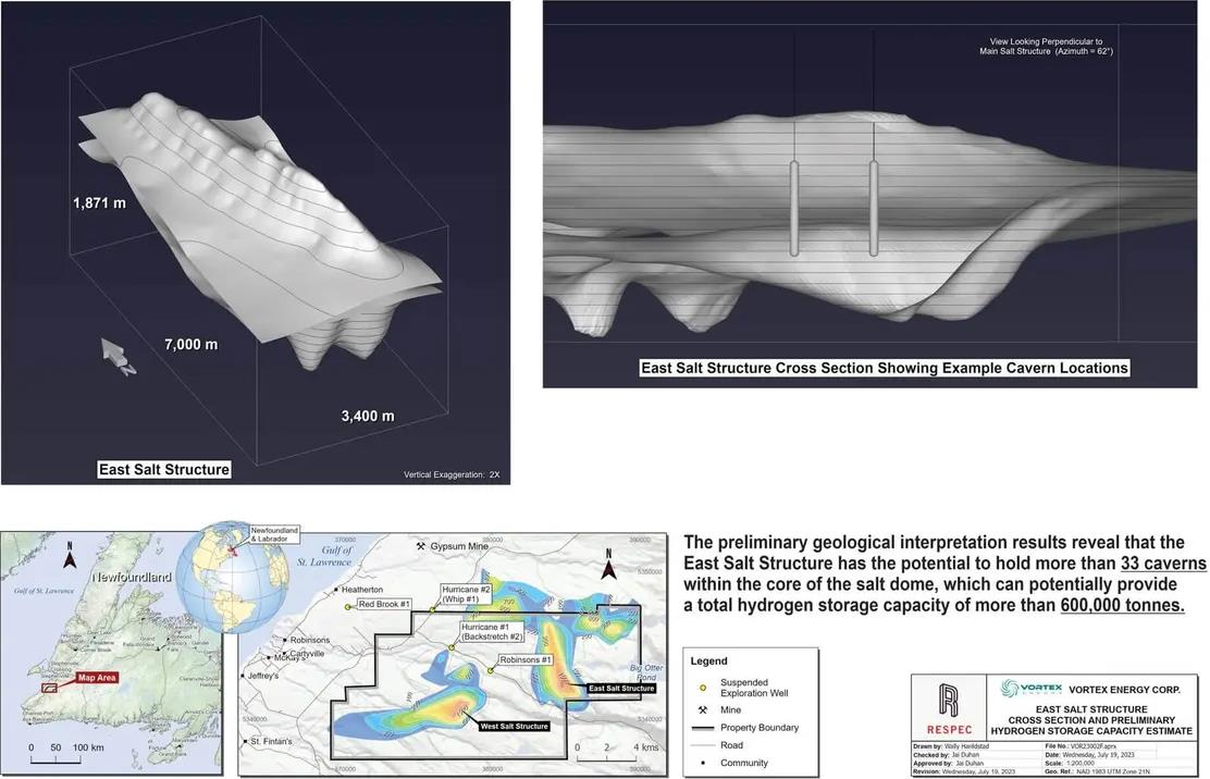 氫啟未來(lái)網(wǎng)獲悉,總部位于加拿大的Vortex Energy最近宣布,在加拿大紐芬蘭的60多個(gè)鹽穴中,估計(jì)可以儲(chǔ)存多達(dá)80萬(wàn)噸的氫氣。