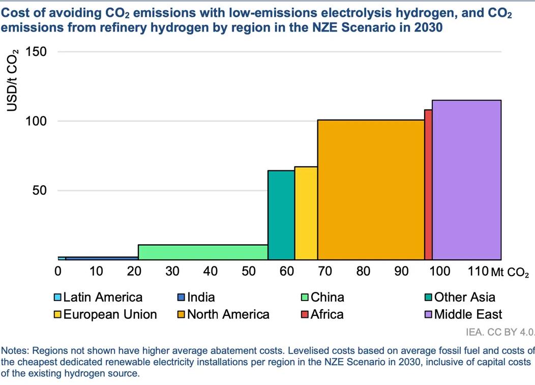 在中國,較低的電解槽安裝成本將與煤制氫的成本差距縮小到每公斤0.2美元。中國和印度代表著5000萬噸的二氧化碳減排潛力。在歐洲和北美,避免二氧化碳的成本不太有利,但仍然會使煉油成本增加2美元/桶。