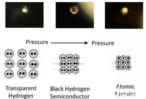 在足夠的壓力下,透明的氫分子變成黑色氫半導體,然后變成金屬氫原子
