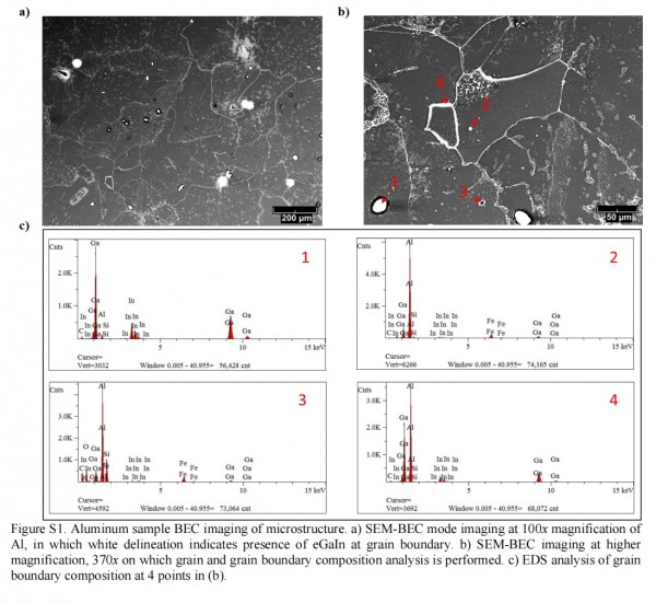 也許最有趣的是摻雜了硅和鎂樣品的結果,鎂是一種經常在回收材料中發現的鋁合金。硅和鎂通過化學方式結合形成鎂硅化物,鎂硅化物以固體沉淀物的形式沉積在內部晶粒的表面。Meroueh假設,當廢鋁中同時存在硅和鎂時,這些沉積物可以作為鎵銦共晶流動的屏障。
