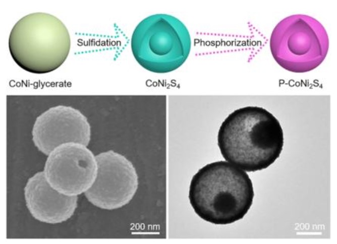由中國河南師范大學(Shuyan Gao)和新加坡南洋理工大學(Nanyang Technological University, Singapore)的熊文(Xiong Wen (David) Lou)領導的團隊現在開發了一種新型、廉價、多功能的電極材料,以鈷(Co)和鎳(Ni)為基礎,用于高效電催化制氫。采用水熱硫化和氣相磷化相結合的方法制備鈷鎳甘油酯納米球。這就形成了由磷摻雜鈷鎳硫化物(P-CoNi2S4)制成的蛋黃殼納米顆粒。這些小球體有著緊湊的內核和多孔的殼,殼與殼之間有空隙——就像蛋黃被蛋清包圍著,所以不接觸殼一樣。