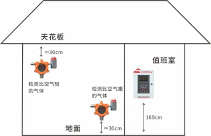 根據被測氣體的性質,如果其密度大于空氣,報警器應安裝在距離地面0.3~0.6米的位置;如果其密度小于空氣,報警器安裝高度應高出釋放源0.5~2米的位置。報警器用于大面積氣體檢測時可采用 10 ㎡~12 ㎡一個進行布置。