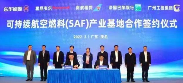 2月25日,東華能源股份有限公司與霍尼韋爾UOP在廣東茂名簽署戰略合作協議,共同建設中國第一個可持續航空燃料產業基地——東華能源(茂名)烷烴與綠色能源資源綜合利用項目。根據協議,雙方將在茂名建設年產量達100萬噸的可持續航空燃料(SAF)生產基地。該項目分為兩個階段,建造了兩套以廚余油和動物脂肪為主要原料的生產裝置。