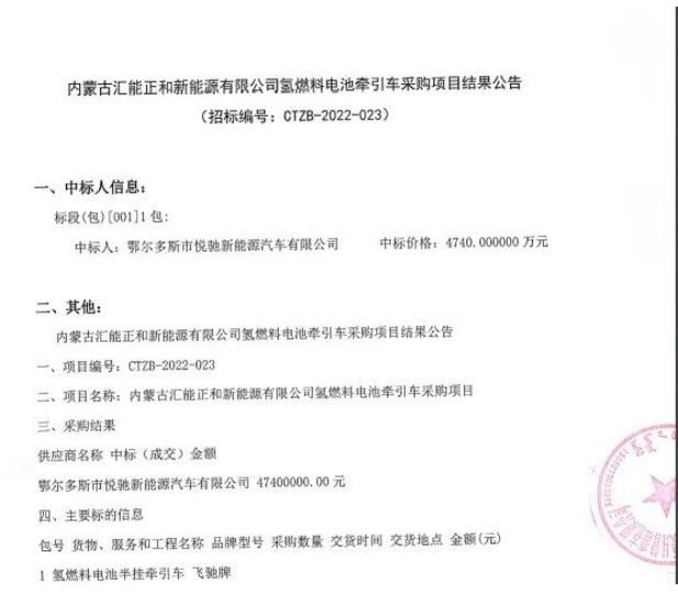 近日,佛山市飛馳汽車科技有限公司(以下簡稱飛馳科技)與鄂爾多斯市悅馳新能源汽車有限公司聯(lián)合中標(biāo)內(nèi)蒙古匯能正和新能源有限公司“氫燃料電池牽引車采購”項(xiàng)目,中標(biāo)(成交)總額4740萬元。