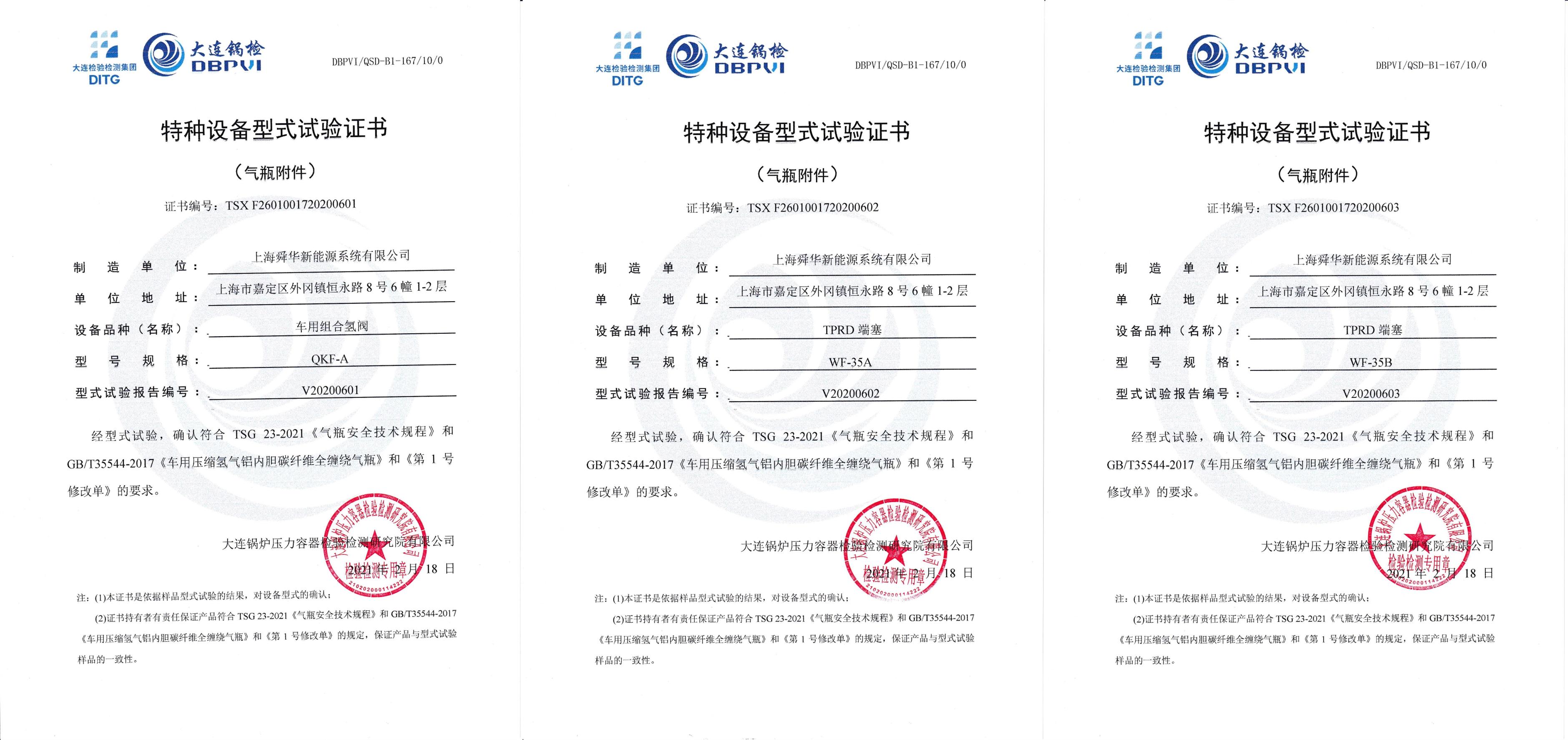 近日,由舜華自主研發的車用組合氫閥QKF-A、TPRD端塞WF-35A、TPRD端塞WF-35B正式通過了大連鍋爐壓力容器檢驗檢測研究院有限公司的型式試驗,并取得了《特種設備型式試驗證書》,確認符合TSG 23-2021《氣瓶安全技術規程》和GB/T35544-2017《車用壓縮氫氣鋁內膽碳纖維全纏繞氣瓶》和《第1號修改單》的要求。