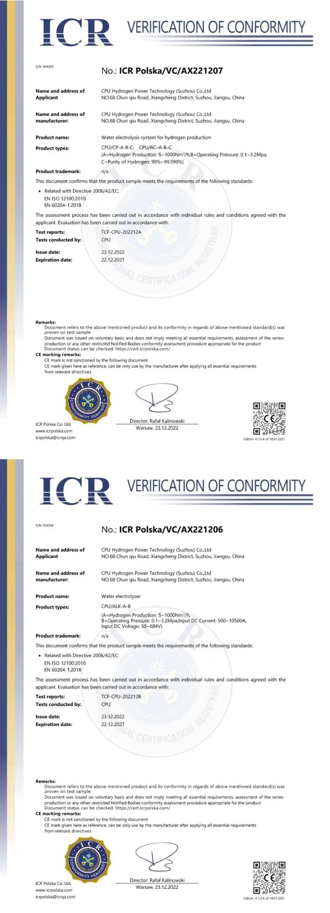歐盟CE認證的獲得標志著希倍優堿性水電解制氫系統的整體安全性能符合歐盟規范、安全技術能力達到全球行業先進水平,可在歐盟國家及其他認可歐盟CE認證國家進行銷售。
