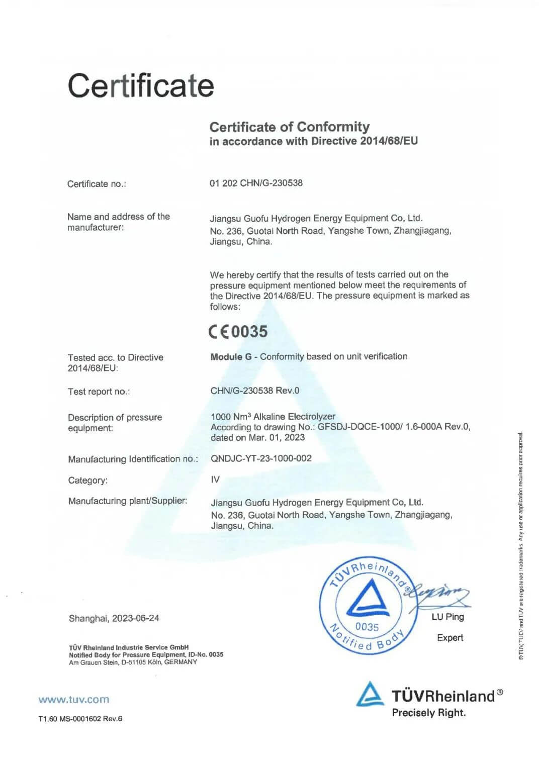 1000Nm3/h堿性水電解槽CE證書(shū)