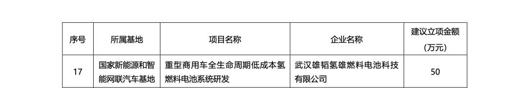 12月7日,武漢市科技局發(fā)布了《市科技局關(guān)于2023年度產(chǎn)業(yè)基地科技創(chuàng)新專項擬立項項目的公示》的通知。武漢雄韜氫雄申報的《重型商用車全生命周期低成本氫燃料電池系統(tǒng)研發(fā)》經(jīng)產(chǎn)業(yè)基地所在區(qū)科技部門推薦、專家評審論證、局黨組會審議等程序,予以批準立項。