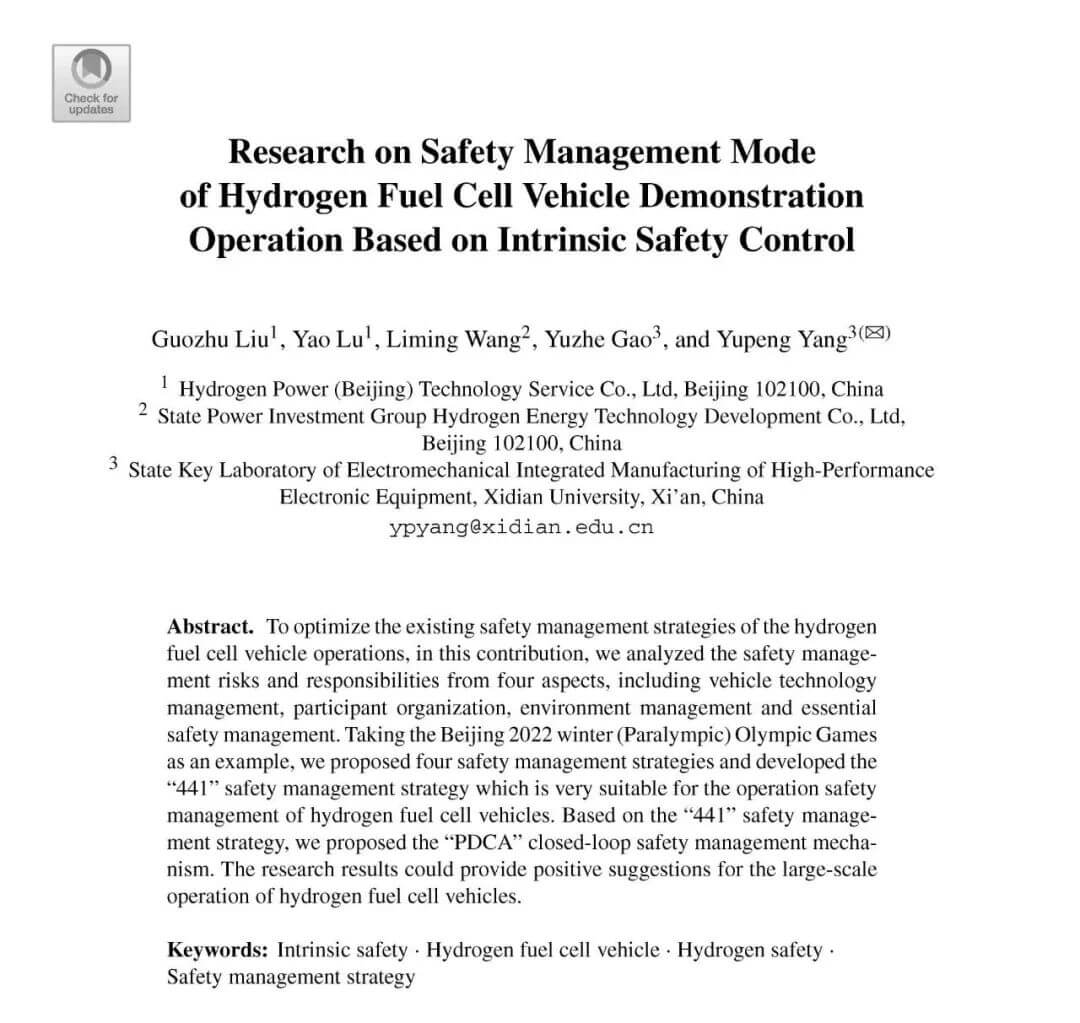 近日,氫動力科技EI論文發表,該論文是氫動力科技聯合國家電投集團氫能科技發展有限公司、西安電子科技大學高性能電子裝備機電集成制造全國重點實驗室內部立項的科研課題《Research on safety management mode of hydrogen fuel cell vehicle demonstration operation based on intrinsic safety control》的成果轉化,日前在Springer Proceedings in Physics(ISSN 1867-4941, EI-Compendex源)出版(EI),EI論文的發表標志著公司氫能零碳交通科技平臺運營安全管理研究邁上新臺階。