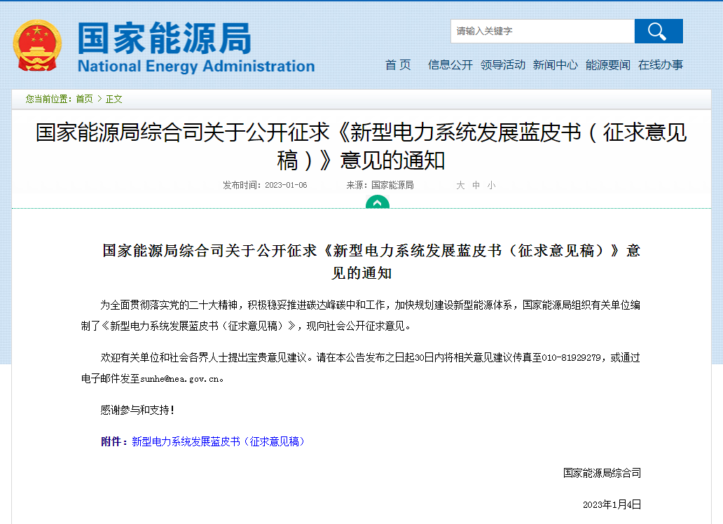 國(guó)家能源局綜合司關(guān)于公開(kāi)征求《新型電力系統(tǒng)發(fā)展藍(lán)皮書(shū)(征求意見(jiàn)稿)》意見(jiàn)的通知