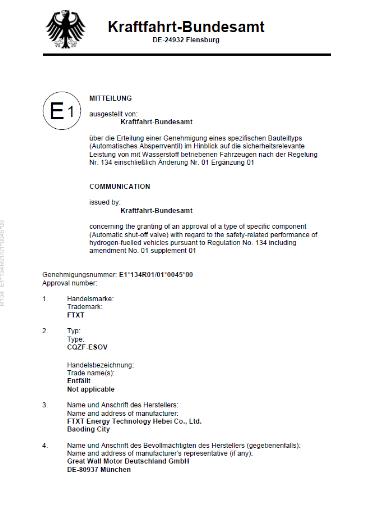 近日,未勢能源氫用瓶閥系列產(chǎn)品之電磁閥,在專業(yè)第三方認(rèn)證機構(gòu)TUV南德的審核下,順利通過耐壓性試驗、泄漏試驗、極限溫度壓力循環(huán)試驗、耐鹽霧試驗、車載環(huán)境試驗、電氣試驗、振動試驗、預(yù)冷氫氣試驗等多項試驗,成功獲得由德國交通部(KBA)頒發(fā)的ECE R134標(biāo)準(zhǔn)認(rèn)證證書,這也是國內(nèi)氫能企業(yè)獲得的首張70MPa E-Mark證書。