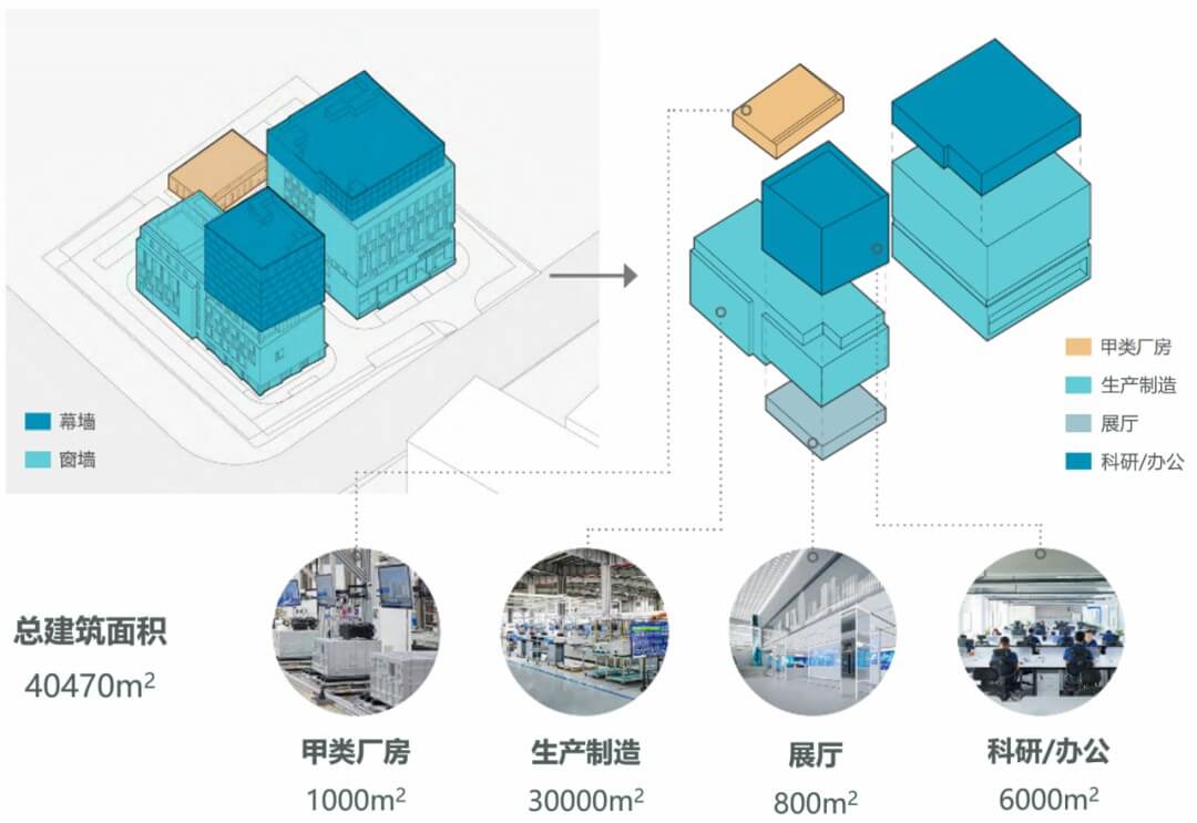 園區功能包括科研辦公、生產制造、甲類廠房及展廳: